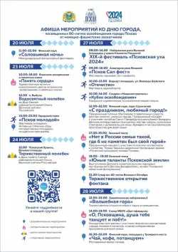 День рождение Пскова отличается разнообразием мероприятий, интересное для себя найдут дети и люди старшего возраста. Много событий планируется для молодежи, в том числе спортивные соревнования, дискотеки, выступления звезд эстрады. Афиша событий в Пскове включает в себя мероприятия возле районных администраций, в центре города, на площадях.