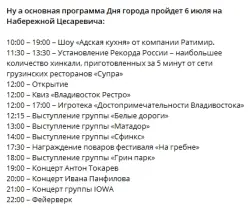 Согласно предварительной информации, программа мероприятий на день города в Владивостоке будет насыщенная, интересная и необычная. Поэтому и местные жители, и туристы смогут найти для себя что – то увлекательное. Итак, в афише событий в Владивостоке на праздник можно отметить следующие мероприятия: